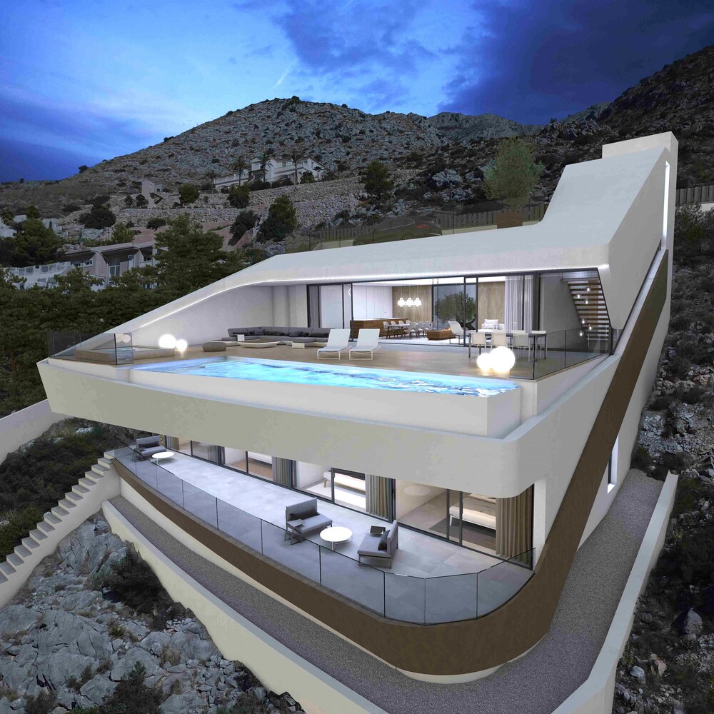 Indrukwekkende luxe Design Villa met spectaculair zeezicht, 4 slaapkamers met badkamer en suite, een lift en een groot infinity pool in het zeer geliefde Altea Hills